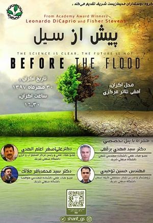 «پیش از سیل» مستندی به کارگردانی فیشر استیونس و بازی لئوناردو دی‌کاپریو، دو تن از برندگان جایزه آکادمی اسکار است که در روز دوشنبه ۳۰ مهر در سالن آمفی تئاتر مرکزی دانشگاه نمایش داده خواهد شد.