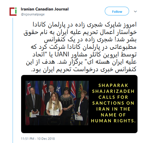 شاپرک شجری زاده یک زن معمولی در کنار تروریست‌های مجاهدین خلق در پارلمان کانادا قرار می‌گیرد و خواستار اعمال تحریم‌های بیشتر علیه هشتاد میلیون ایرانی می‌شود.