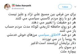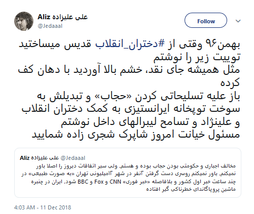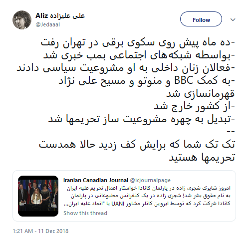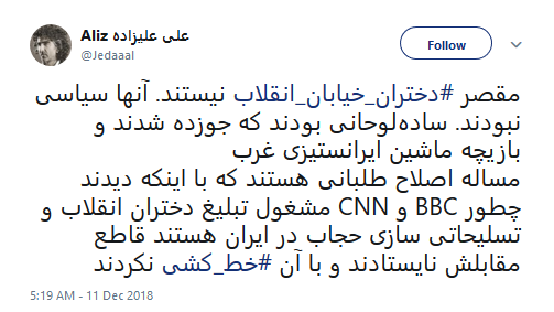 «ده ماه پیش روی سکوی برقی در تهران رفت؛ به واسطه شبکه‌های اجتماعی بمب خبری شد؛ فعالان زنان داخلی به او مشروعیت سیاسی دادند؛ به کمک BBC و من وتو و مسیح علی نژاد قهرمان سازی شد؛ از کشور خارج شد؛ تبدیل به چهره مشروعیت ساز تحریم‌ها شد... تک تک شما که برایش کف زدید حالا همدست تحریم‌ها هستید.»