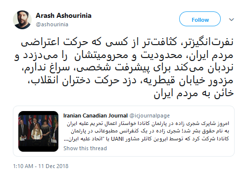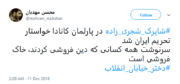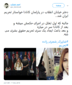 و بالاخره یک سال بعد ماموریت نهایی دختران خیابان انقلاب به عهده شاپرک شجری زاده ۴۲ ساله قرار گرفت، آنهم در پارلمان کانادا.