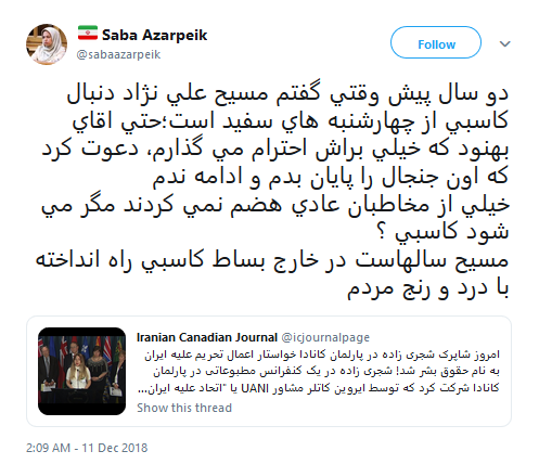 «شاپرک شجری زاده»، یکی از دخترانی که در پروژه «چهارشنبه‌های سفید» برای مقابله با حجاب شرکت کرده بود، بعد از مدتی به خارج از کشور رفته و حالا سر از پارلمان کانادا در آورده است. «مسیح علی‌نژاد» پروژه چهارشنبه‌های سفید را با کمک کشور‌های غربی کلید زده است، اما هر روز بیشتر پشت پرده این پروژه ضدحجاب آشکار می‌شود. حتی در این عرصه اصلاح طلبانی که علی نژاد سبقه سیاسی خود را از این جریان گرفته به انتقاد از این پروژه ضد ایرانی پرداخته اند و آنرا خیانتی نسبت به مردم ایران توصیف کرده اند.