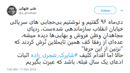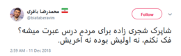 >> این وطن فروشی آشکار موج گسترده‌ای از واکنش‌ها را در فضای مجازی در بر داشت، اما شاید مهم‌ترین گزاره مطرح شده همین نمایان شدن ذات اصلی این عروسک‌های خیمه شب بازی بود. افرادی که به دروغ ادعای خیرخواهی زنان و جامعه ایرانی را داشتند، ولی نهایتا تحریم شدن همان مردم را در میان دشمنان ایران فریاد کردند. در پایان نگاهی خواهیم داشت به چندین مورد از واکنش‌های کاربران فضای مجازی به وقاحت شاپرک شجری زاده در وطن فروشی.