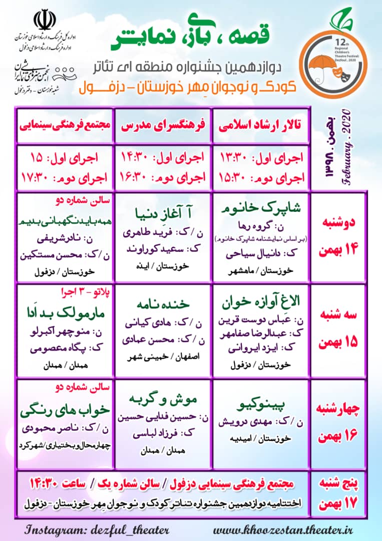 دوازدهمین جشنواره منطقه ای تئاتر کودک و نوجوان مهر خوزستان از 14 تا 17 بهمن ماه به میزانی شهرستان دزفول برگزار می شود.