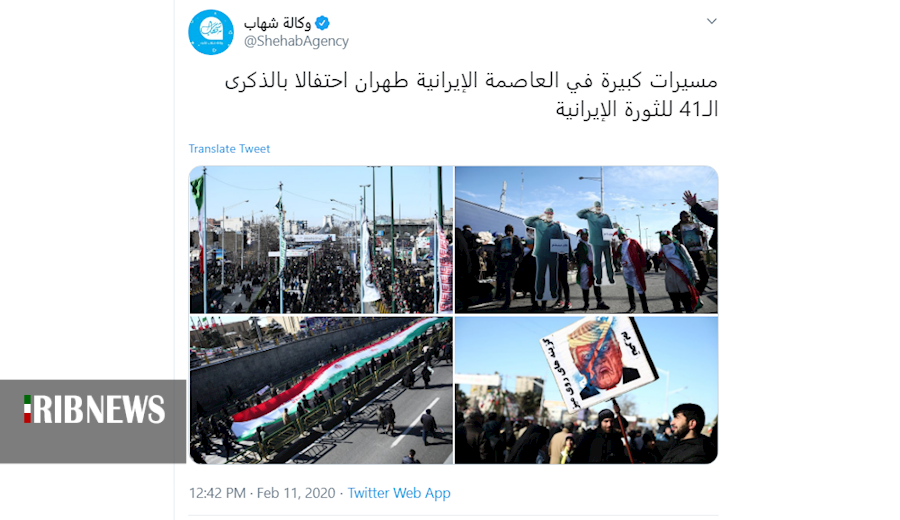 خبرگزاری شهاب فلسطین در حساب کاربری خود در توئیتر با انتشار عکسهایی، نوشت: «راهپیماییهای پرشور در تهران، پایتخت ایران در جشن چهل و یکمین سالگرد پیروزی انقلاب»