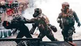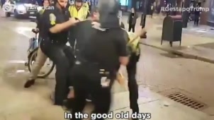 در اینجا تصاویر پخش میشود که چند مأمور پلیس یک شهروند را با چوبدستیهای بلندی که در دست دارند، به شدت کتک میزنند. همچنین تصاویری از پرتاب گاز اشک آوز به سوی معترضان در خیابانهای آمریکا نمایش داده میشود.
