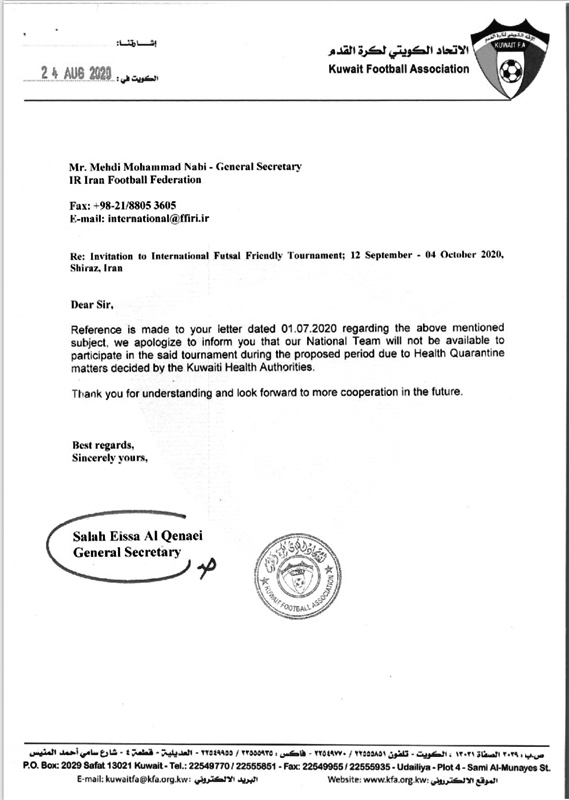 مشکلات ناشی از ویروس کرونا و شیوه نامه های بهداشتی داخلی کشور کویت باعث انصراف این تیم شد.