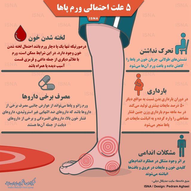 به گزارش گروه وب گردی خبرگزاری صدا و سيما، ورم پاها از جمله مشکلاتی است که در صورت خفیف بودن، نگرانکننده نیست، اما در موارد شدیدتر، مشکل ممکن است جدیتر باشد و خوددرمانی برای آن توصیه نمیشود. پزشکان توصیه میکنند در صورت ورم ناگهانی پاها و ادامه یافتن آن برای مدت طولانی، درد یا تغییر رنگ پوست، باید حتماً به پزشک متخصص مراجعه شود. اینفوگرافی ذيل به پنج مورد از دلایل ورم پا اشاره میکند.
