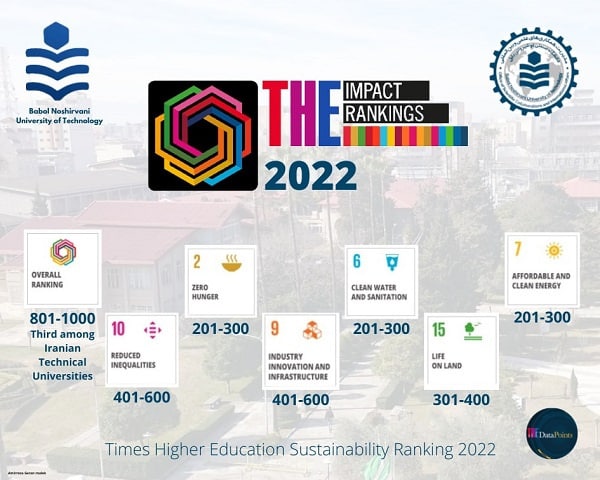 دانشگاه صنعتی نوشیروانی بابل برای چهارمین سال متوالی ارزیابی شده و رتبه جهانی اینگونه است: حذف گرسنگی ۳۰۰-۲۰۱، دسترسی به آب بهداشتی ۱۰۰ پله صعود ۳۰۰-۲۰۱، انرژی پاک و مقرون به صرفه ۳۰۰-۲۰۱، زندگی بر روی خشکی ۴۰۰-۳۰۱، کاهش نابرابریها ۲۰۰ پله صعود ۶۰۰-۴۰۱، صنعت، ابتکارات و زیرساختها ۶۰۰-۴۰۱ و در دیگر شاخصها نیز حائز رتبههای مناسبی شده است.