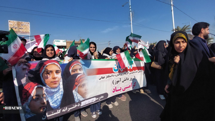 جمعی از دانشآموزان در این راهپیمایی پلاکاردهایی با مضامین مرگ بر اسراییل، مرگ بر آمریکا، ۱۳ آبان، یوم الله و جانم فدای رهبر در دست داشتند.