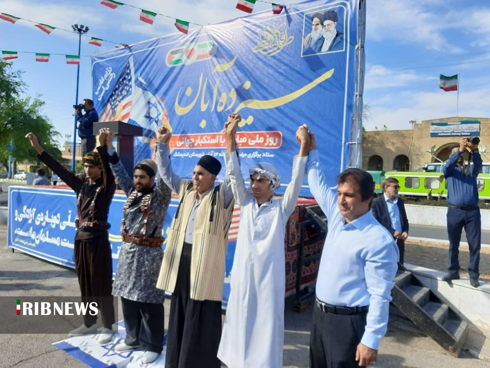 امروز و از ساعتهای اولیه صبح، مردم شهرهای مختلف استان خوزستان بار دیگر همبستگی و اتحاد خود را در دفاع از آرمانهای انقلاب و حفظ ایران اسلامی نشان دادند و با سر دادن شعار مرگ بر اسراییل و مرگ بر آمریکا انزجار خود را از «شیطان بزرگ» فریاد زدند.