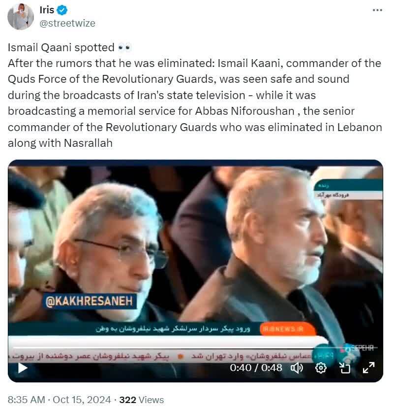 صفحه «لِبِنیز فرانت» در شبکه اجتماعی ایکس با انتشار ویدیوی حضور سردار اسماعیل قاآنی در مراسم تشییع پیکر شهید عباس نیلفروشان در میدان امام حسین تهران نوشت: «همین حالا، میدان امام حسین در تهران. اسماعیل قاآنی، فرمانده نیروی قدس، در مراسم تشییع پیکر فرمانده شهید سپاه پاسداران، عباس نیلفروشان، شرکت کرده است. طبق اعلام رسانه‌های صهیونیست، او در بیروت ترور شده است.»