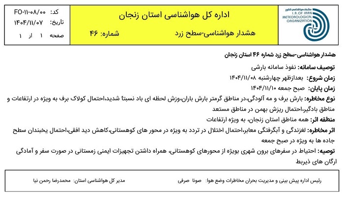 برای این وضعیت هشدار هواشناسی سطح زرد نیزصادر شده است.